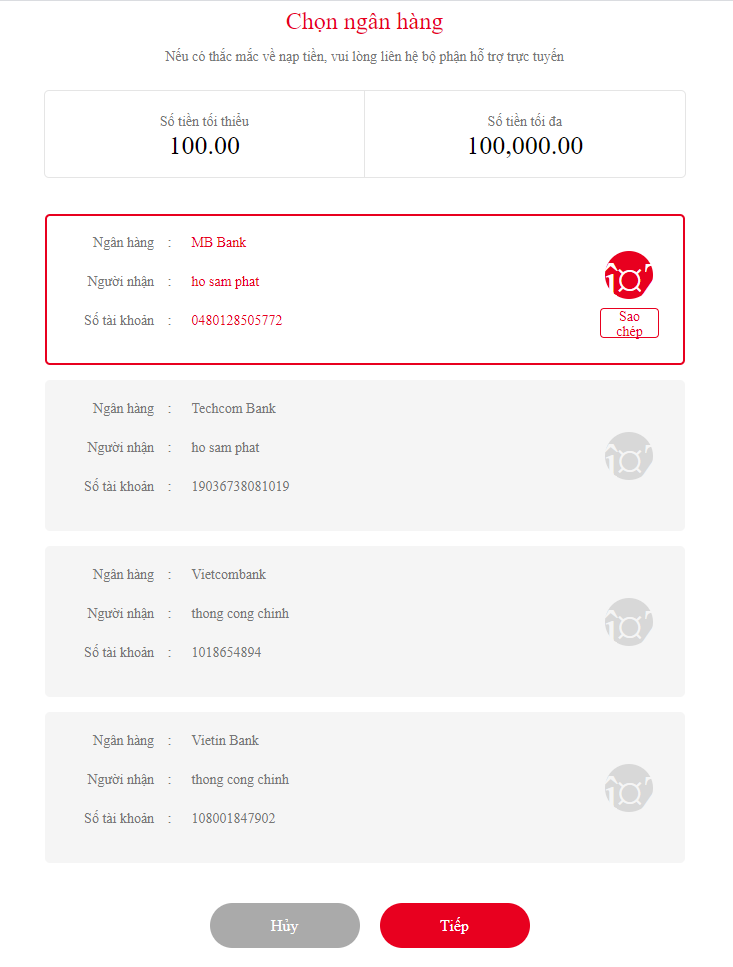 Sau khi đăng nhập vào win3888 anh em chọn vào mục Nạp tiền trang web sẽ hiện thị ra trang cho anh em chọn lựa ngân hàng muốn chuyển vào
