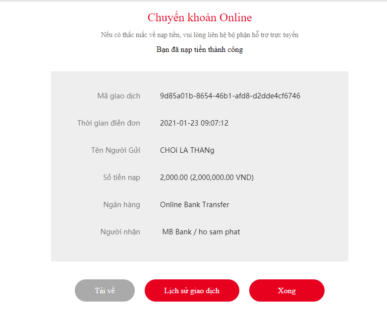 - Nếu chuyển khoản thành công không được cập nhật, Vui lòng liên hệ [ Hỗ trợ trực tuyến] để được hỗ trợ